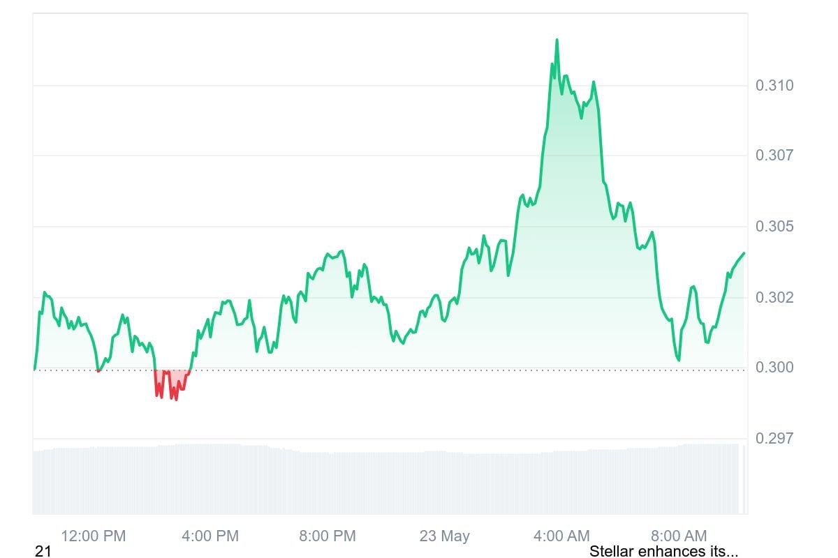 这一发展推动了Stellar价格在同一时间框架内略微上涨。截至发稿时,XLM交易价格为0.3013美元,根据CoinMarketCap数据,上涨0.93%。该资产此前曾达到0.3117美元的峰值,随后有所回调。