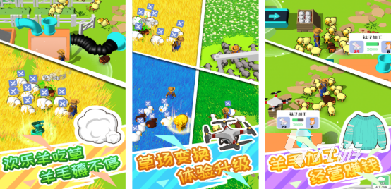 解压感超强,将放置以及经营玩法巧妙结合,大家可在虚拟游戏世界里亲自养羊,感受养羊时的快感,比如在春天来临时,一望无际的绿色大草原上,就要从事着放羊的工作,让这些羊实现青草自由。而等到换季时还需用自动剪毛机给羊剪毛,收获大量羊毛之后,也可加工成各种农产品或者是成品出售赚钱。